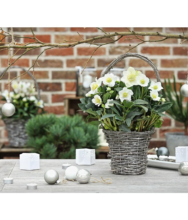 Die Christrose wird oft auch als Blumen-Königin des winterlichen Gartens bezeichnet. Und das zu Recht… Die kühlen Schönheiten begeistern mit ihren zarten und unschuldig weißen Blütenjeden Pflanzenliebhaber und bereichern im Winter nicht nur Blumenbeete sondern auch Töpfe und Schalen. Um die feengleiche Pracht auch bewundern und genießen zu können sollten Sie die Christrosen in der Nähe zum Haus oder am Eingangsbereich platzieren. Besonders vor der Haustüre können sie wunderbar in die Dekoration miteinbezogen werden. Um Ihnen die winterliche Dekoration leichter zu machen haben wir für Sie ein fertiges Arrangement bestehend aus einem attraktiven Henkelkorb mit einer üppig blühenden Christrose.
