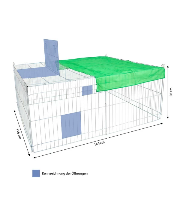 An der frischen Luft viel Bewegungsfreiheit genießen und dabei auch noch leckeres Gras mümmeln? Mit dem Dehner Freilaufgehege Björn geht dieser Traum für Ihre Kaninchen und Meerschweinchen in Erfüllung. Stellen Sie das Kaninchen Freigehege aus verzinktem Metall einfach zu Hause im Garten auf eine Rasenfläche, befestigen Sie den Freilauf mit den mitgelieferten Heringen im Untergrund und lassen Sie Ihre Kleintiere einziehen. In diesem Kaninchen Freigehege erleben Kaninchen und Meerschweinchen unbeschwerte Tage an der frischen Luft und sind dabei bestens vor Fressfeinden wie Katzen und Greifvögeln geschützt. Praktischerweise verfügt das Dehner Freilaufgehege Björn auch über eine Abdeckung aus Stoff, die einen Teil des Freigeheges vor der Sonne schützt. Genau unter dieser Abdeckung befindet sich auch eine Öffnung im Dach, über die Sie Kaninchen und Co. aus dem Freilaufgehege herausholen oder Futter und Wasser hineinstellen können.
