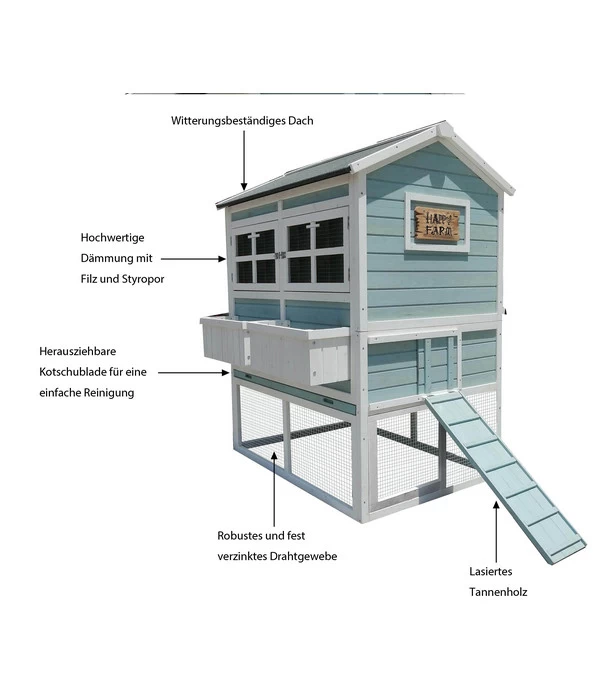 Die größte Gefahr für Hühner sind Räuber wie Füchse und Katzen. Bei diesem hochwertigen Hühnerstall von Dehner bildet das robuste und fest verzinkte Drahtgewebe eine Barriere, die für ungebetene Besucher kaum zu überwinden ist. Die Wände aus lasiertem Tannenholz sind stabil und halten Angriffen ebenso stand wie Wind und Wetter. Beim Dehner Hühnerstall Happy Farm Agata werden die Hühnerleiter und die Sitzstangen ebenso mitgeliefert, wie schmucke Blumenkästen. Die herausziehbare Kotschublade ist praktisch und sorgt dafür, dass der Stall leicht sauber gehalten werden kann. Bestellen Sie diesen Hühnerstall in seinem sonnigen Look gleich hier online und genießen Sie schon bald die täglich frischen Frühstückseier.