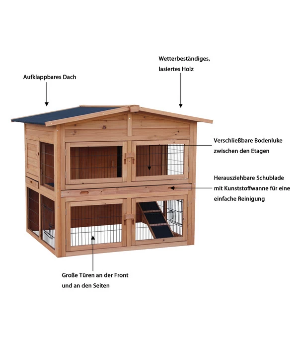 Sie suchen ein neues Heim für Ihre Kaninchen, Zwergkaninchen oder Meerschweinchen, am besten eine Kombination aus Kaninchenstall und Freigehege? Dann passt der Dehner Kaninchenstall Villa bestens zu Ihnen. Der extragroße Stall für Kaninchen bietet auf zwei Etagen Rückzugsmöglichkeiten und Freilauf, die durch eine verschließbare Bodenluke voneinander getrennt werden können. Damit ist der 135 x 112 x115 cm große Hasenstall auch optimal zur Gruppenhaltung geeignet. Herausnehmbare Schubladen mit Kunststoffböden erleichtern Ihnen die Reinigung des zweiten Stockwerks deutlich.