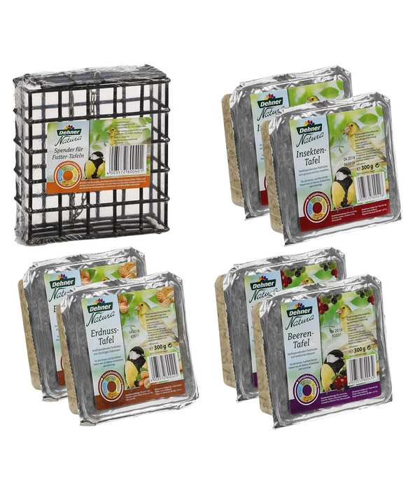 Wildvogelfutter, Set aus je zwei Futtertafeln mit Beeren, mit Erdnüssen und mit Insekten + Futtertafel-Spender