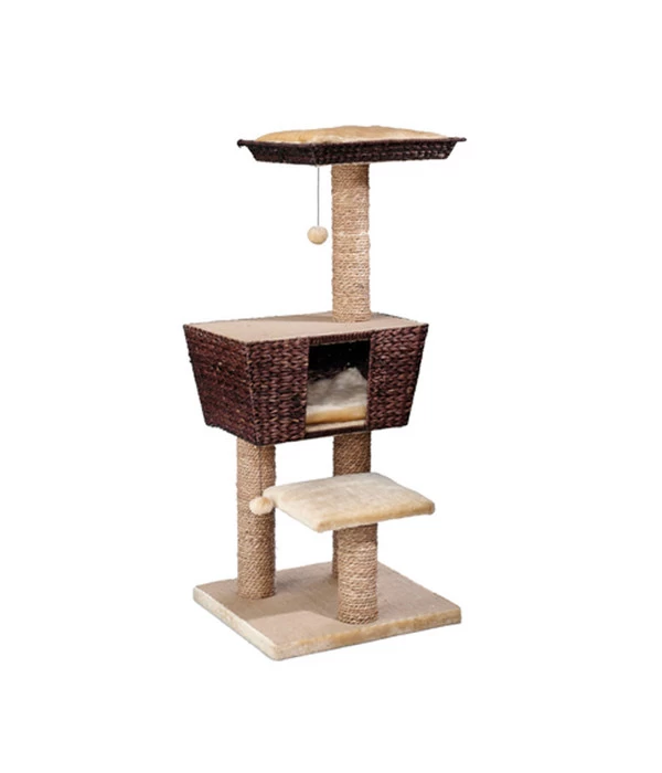 Mit dem ebi Kratzbaum Trend Grenada bieten Sie Ihrem Tier den perfekten Indoor-Spielplatz. Vor allem Hauskatzen benötigen besonders viel Abwechslung. Der ebi Kratzbaum Trend Grenada verspricht besonders viel Spiel, Spaß und Aktion und ist auch optisch ein wahrer Blickfang. Drei schicke Plattformen laden nicht nur zum Spielen ein, sondern hier hat Ihr Stubentiger auch immer alles im Überblick. Die Kuschelhöhle mit Kissen perfekter Rückzugsort oder zum Schlafen. Die im ebi Kratzbaum Trend Grenada verarbeitete Wasserhyazinthe, einem robusten und reißfesten Naturprodukt, verleihem dem Katzenkratzbaum ein natürliches Aussehen im modernen Look. Zwei Spielbälle am elastischen Band laden nicht nur zum ausgiebigen Spielen ein, sondern wecken auch den Jagdinstinkt Ihres Lieblings. Die Stämme, welche mit Sisal ummantelt sind, eignen sich für die wichtige Krallenpflege. Mit dem Kratzbaum von ebi wird es Ihrer Samtpfote sicherlich nie langweilig.