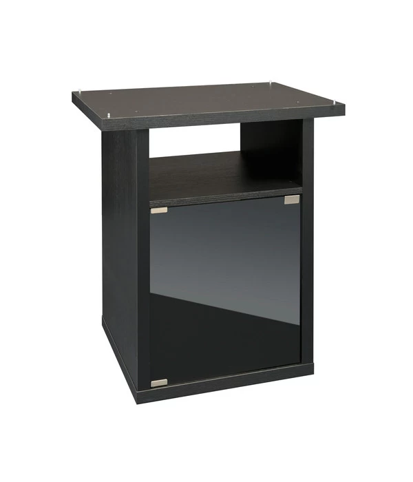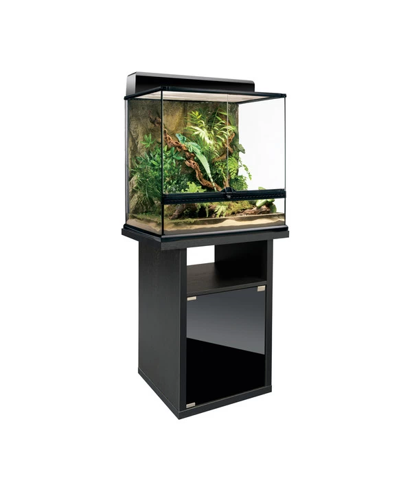 Das Vollglasbecken ist besonders stabil, wasserdicht und vielseitig nutzbar – entweder als Wüstenterrarium mit optimaler Wärmespeicherung oder aber als Regenwaldterrarium mit einer bis zu 100 % regulierbaren Luftfeuchte. Das Becken beinhaltet einen erhöhten Bodenrahmen und damit genügend Platz, um darunter die Substratheizung oder die Wärmekabel unterzubringen. Ganz gleich, für welches Beckenformat Sie sich entscheiden, mit der Exo Terra® Terrarien Kombination 60×45 cm haben Sie jede Menge Gestaltungsspielraum, um Ihren Reptilien einen optimalen Lebensraum zu schaffen. Die bequeme Fütterung Ihrer Tiere sowie die Befeuchtung und Wartung des Terrariums ermöglichen die zwei nach vorne öffnende Türen, die sich zum einen sicher verriegeln lassen und zum anderen extra hoch platziert sind, um hohe Substratschichten, Wasserstellen oder Höhlen zu ermöglichen. Damit fördern Sie das natürliche Grab- und Versteckverhalten Ihrer Tiere. Jedes Terrarium mit Schrank beinhaltet auch ein patentiertes duales Ventilationssystem zur unerlässlichen Belüftung. Es hält die Frontscheiben des Beckens frei von Kondenswasser und sorgt für den optimalen Luft-Wärme-Austausch. Auch integriert ist eine Netzgitterabdeckung, aus feinmaschigem Metallgewebe, das überschüssige Hitze ableitet, UVB- und infrarotes Licht in das Terrarium lässt und durch 4 drehbare Regler an den Seiten komplett abnehmbar ist. Zudem befinden sich an der Rückseite der Netzgitterabdeckung an beiden Seiten je 5 verschließbare Kabel-Kanäle, durch die Sie alles einfach installieren können, was Sie zur Wärmeerzeugung, Dekoration oder als anderes Zubehör im Inneren des Terrariums brauchen. Teil der Exo Terra® Terrariumkombination 60×45 cm ist auch eine perfekt passende Lampenabdeckung,, in der verschiedene, separat erhältliche Leuchtmittel mit bis zu 25 W, wie z. B. energiesparende UV-Kompaktlampen und Breitspektrum-Tageslichtlampen kombiniert werden können. Die Lampenabdeckung ist einfach zu installieren und bietet einen hochwertigen Reflektor zur optimalen Lichtausbeute sowie eine Aussparung zur Installation von Zubehör, wie Thermometer oder Hygrometer. Ein ganz wichtiger Teil der Exo Terra® Terrarium Kombination 60×45 cm ist der praktische wie optisch zeitlose schwarze Holz-Unterschrank mit viel Stauraum, dessen Schranktür sich dank magnetischer Verschlüsse einfach öffnen lässt. Das integrierte Fach bietet ausreichend Platz für Futter und Zubehör.