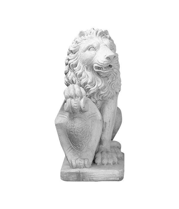Der Löwe als König der Tiere war einst das beliebteste Wappentier, denn er symbolisiert Mut, Kraft und Königlichkeit wie kein zweites Tier. Beeindruckend selbstbewusst, ja majestätisch, ist auch der Eindruck, den der fantasieco Steinlöwe dem Betrachter vermittelt. Voller Würde trägt er das Wappenschild, den Blick weit in die Ferne gerichtet. Wäre der fantasieco Steinlöwe nicht auch in Ihrem Garten ein krönendes Highlight, das das noble Flair alter Parkanlagen verbreitet? Der fantasieco Steinlöwe macht sich aber auch im Eingangsbereich prächtig und heißt dort Ihre Gäste auf stilvolle Weise willkommen. Besonders dekorativ aber ist die Wirkung, wenn dieser fantasieco Steinlöwe, der sein Wappenschild rechts trägt, seine Wächterfunktion im Duo zusammen mit seinem Spiegelbild ausüben darf.