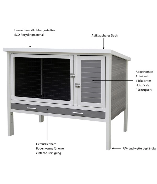 Sie sind begeisterter Besitzer von Kaninchen, Zwergkaninchen oder Meerschweinchen und wissen, was bei der Pflege ihres Zuhauses komfortabel ist und was eher stört. Deshalb suchen Sie nach einer Lösung, die Ihren Tieren gefällt und Ihnen intelligente Funktionen bietet. Der KERBL ECO-Kleintierstall Samy XL wird Ihnen genau deshalb sehr gut gefallen. Denn neben seinen Komfort-Funktionen zeichnet sich dieses Nagerzuhause durch sein besonderes Material aus: umweltfreundlich hergestelltes ECO-Recyclingmaterial, das aus ca. 60 % Eco-Kunststoff und 40 % Holz besteht. Darin haben es Ihre Lieblinge das ganze Jahr über richtig gut, da es wasserdicht ist und gleichermaßen gegen Hitze wie Kälte isoliert. Die kleinen Fellnasen können darin frei zwischen der nach vorne offenen „Loungeˮ und dem hinter dem Durchschlupf liegenden Ruhebereich wählen. Machen Sie sich und Ihren Nagern eine Riesen-Freude mit dem KERBL ECO-Kleintierstall Samy XL, dieser topmodernen Kuschelhöhle!