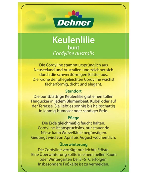 Keulenlilien sind relativ anspruchslos bezüglich der Pflege. Die bunte Keulenlilie sollte einen hellen bis halbschattigen Standort erhalten, da bei einem zu dunklem Standort die Blätter vergrünen können. Ein Platz an der Sonne ist ebenso geeignet, dort erhöht sich aber der Wasserbedarf der Keulenlilie. Generell sollten Sie das Substrat der Pflanze stets leicht feucht halten, sodass es nicht völlig austrocknet und auch Staunässe vermieden wird. Achten Sie deshalb auf eine regelmäßige und durchdringende Bewässerung. Gießen Sie erneut, sobald die oberste Erdschickt angetrocknet ist. In der Wachstumszeit, etwa von April bis August, bevorzugt die Keulenlilie eine Düngerzugabe im zweiwöchentlichen Rhythmus. Ideal um Mangelerscheinungen vorzubeugen und das gesunde Wachstum der Keulenlilie zu fördern, eignet sich der Dehner Palmen-Dünger. Während der Wintermonate sollten Sie die Keulenlilie zurück ins Haus holen und kühl und hell überwintern.