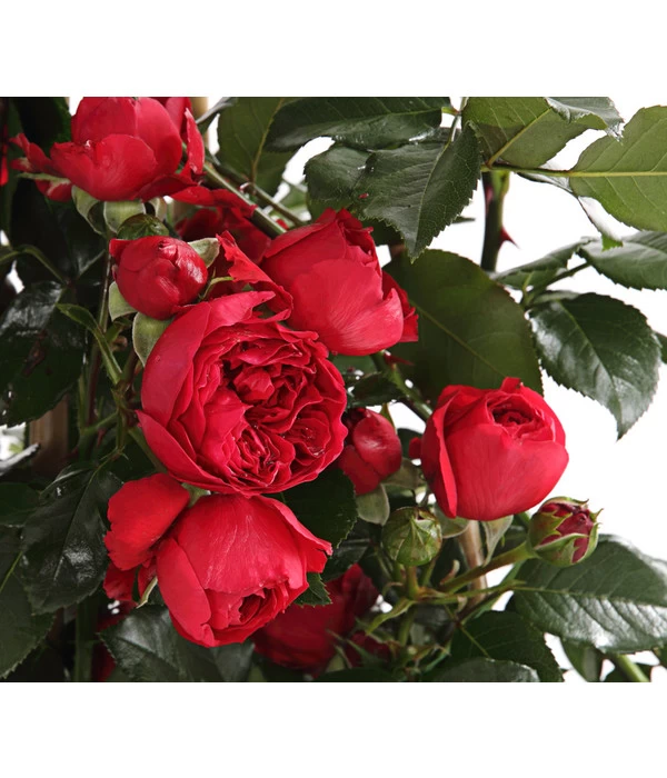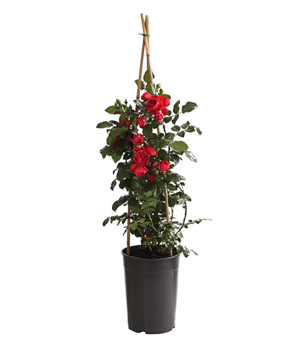 Ideal für Hauswände, hohe Zäune oder auch schöne hohe Rosenbögen: Kletterrosen nehmen Rankgerüste bis zu einer Höhe von 2,50 Meter problemlos ein. Die Pflanzen entwickeln von unten an eine sehr gute Verzweigung, wachsen aufrecht und breit und bilden viele, dunkelgrüne, ledrige Blätter. Besonders beeindruckend ist die große Blütenfülle von Kletterrosen, die sie weithin zum Blickfang im Garten machen.