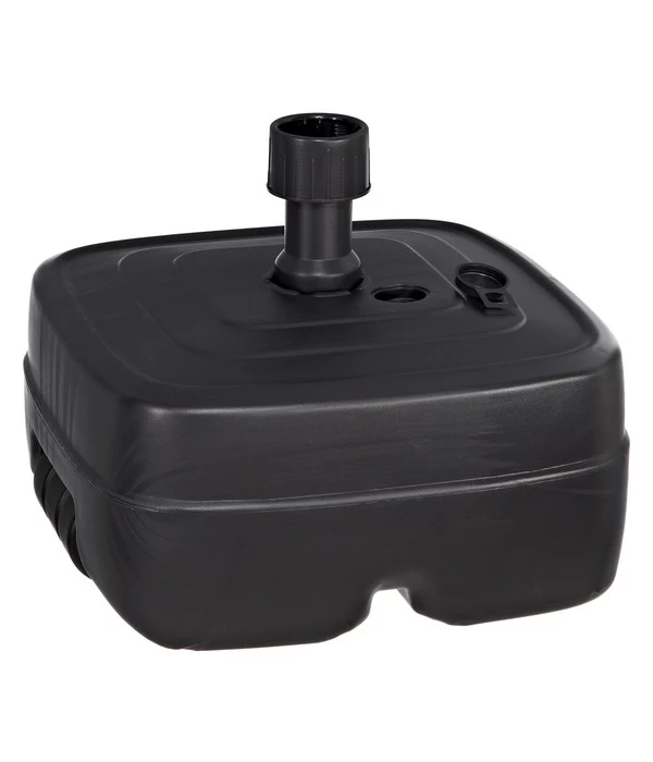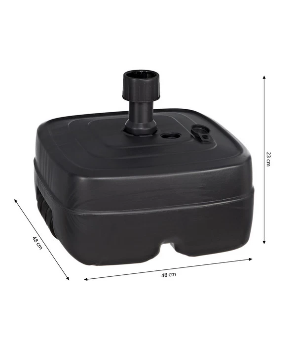 Leichter Kunststoff-Schirmständer für Ihren Sonnenschirm bis zu einem Durchmesser von 350 cm. Zum Beschweren und um eine optimale Standfestigkeit zu erlangen, können Sie den Ständer mit Sand oder Wasser befüllen. Ein Sonnenschirm mit einem Stock-Durchmesser von 33 – 50 mm passt ideal. Für einen festen Stand wird eine Sandfüllung von 60 kg bzw. eine Füllung mit Wasser empfohlen. Beachten Sie, dass der Schirm bei starkem Wind geschlossen werden muss.
