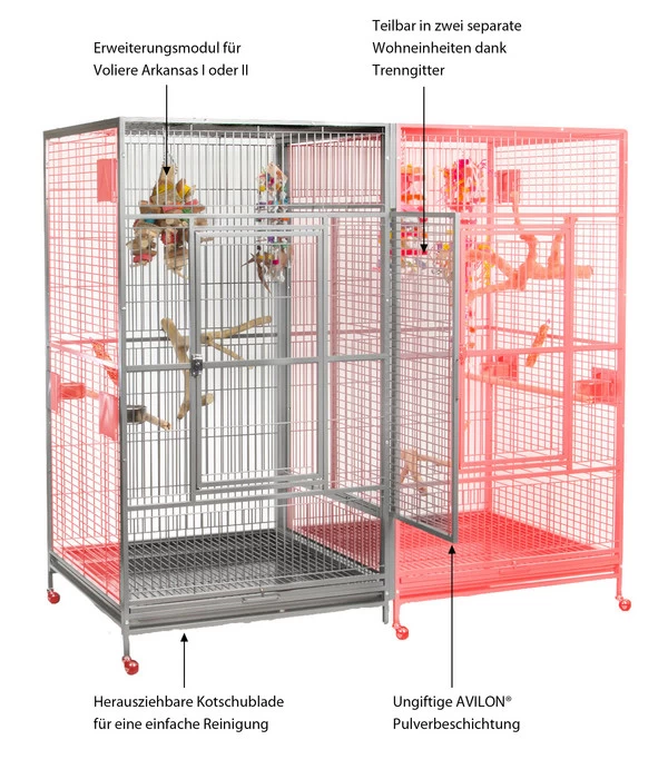 Das Metall des Vogelvoliere-Anbausatzes besticht durch seine schwermetallfreie und damit ungiftige AVILON® Pulverbeschichtung. So garantieren Sie Ihren Vögeln eine sichere und tierfreundliche Haltung. Für einen schnellen Einsatz des Moduls und mehr Abwechslung im Vogelalltag empfiehlt es sich, die Käfigeinrichtung und das Vogelspielzeug gleich mitzubestellen. Entscheiden Sie sich für den Montana Vogelvoliere Anbausatz für Arkansas und überzeugen Sie sich selbst von seinen vielen Vorteilen!
