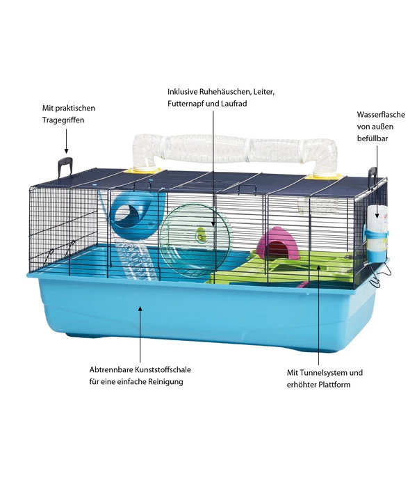 Die große Tür an der Vorderseite des Nagerheims Sky Metro der Marke SAVIC ermöglicht Ihnen einen leichten Zugang zum Füttern Ihres Lieblings und zum Reinigen des Käfigs. Wenn Sie die Behausung einmal umstellen wollen, nutzen Sie einfach die Griffe an beiden Seiten, die Ihnen das Bewegen des Käfigs erheblich vereinfachen. Damit Ihr kleiner Nager auch immer mit genügend Flüssigkeit versorgt ist, erhalten Sie zum Sky Metro noch eine Trinkflasche dazu, die Sie komfortabel am Außengitter anbringen können. Schaffen Sie Ihrem Liebling einen Rückzugsort in seinem Freigehege und bestellen Sie das SAVIC Nagerheim Sky Metro am besten jetzt gleich zu sich nach Hause!