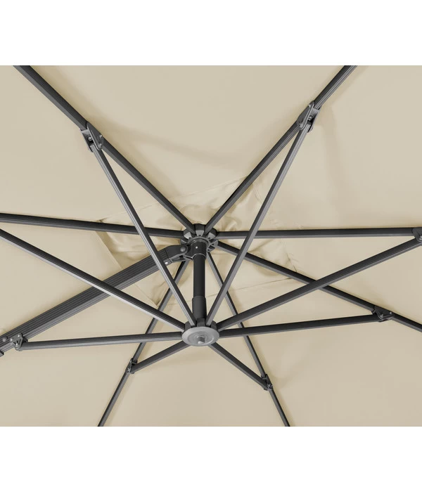 Der Schneider Ampelschirm Rhodos Smart hat ein anthrazitfarbenes, pulverbeschichtetes Gestell aus Aluminium, sodass Sie es unbesorgt draußen im Freien stehen lassen können. Der Sonnenschirm ist außerdem mit einem Kurbelsystem ausgestattet, das Ihnen komfortables und leichtes Öffnen und Schließen des Schirmes erlaubt. Durch Betätigung des Handhebels am Drehgelenk lässt sich der Schirm um 360° drehen, um Ihnen ohne viel Aufwand optimalen Schutz bei fast jeder Sonnenstellung zu geben. Im Lieferumfang zum Schneider Ampelschirm Rhodos Smart ist außerdem ein Plattenständer für 4 Wegeplatten der Größe 50 x 50 cm enthalten, der dem Schirm einen stabilen Stand gibt. Sie müssen also nur die Wegeplatten besorgen und schon ist der Sonnenschirm einsatzbereit.