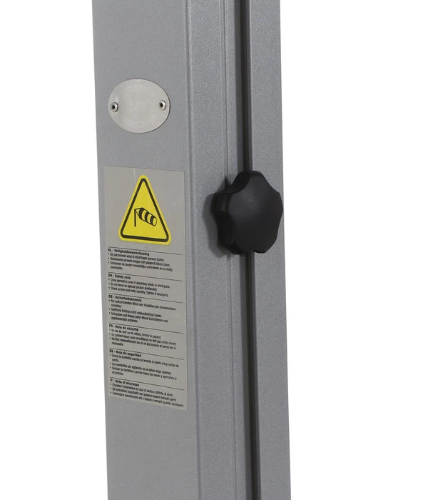 So können Sie den Schirm mit Hilfe des Fußpedals um 360° drehen; Sie können die Schirmfläche aber auch mit einem Schiebegriff in 6 Positionen vertikal kippen, wenn die Sonne tiefer steht. Sein volles Schattenpotenzial entwickelt er, indem Sie ihn ganz einfach mit einer Kurbel aufspannen. An dieser Aufzählung – Fußpedal, Schiebegriff und Kurbel – können Sie ebenfalls erkennen, dass das Handling des Ampelschirms leicht und ohne Kraftaufwand möglich ist. Und die Materialwahl verspricht Freude für viele Jahre. Denn das Gestell und die Streben sind aus hochwertigem, pulverbeschichtetem Aluminium, die Strebenenden sind sogar verschraubt. Der Bezug besteht aus einer festen Polyester-Qualität mit 240g/m² und kann bei Bedarf gewaschen werden.