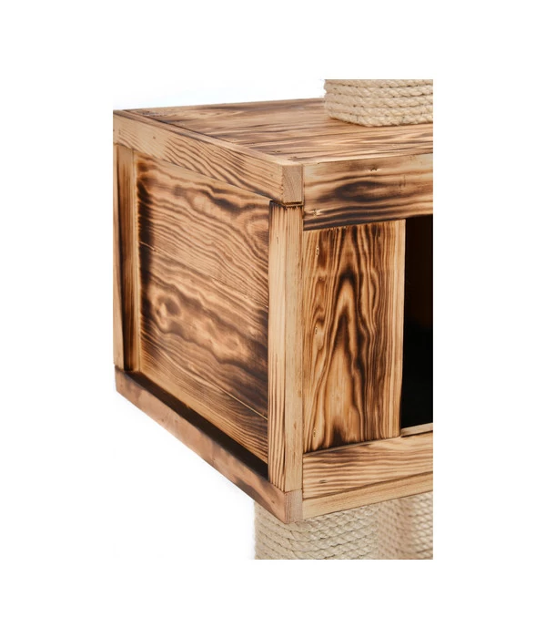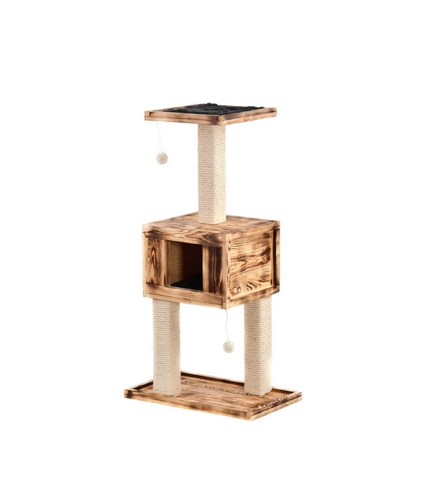 Drei Ebenen stehen Ihrer Katze oder Ihrem Kater zur Verfügung, um auf diesem Kratzbaum nach Belieben zu liegen, zu schlafen oder einfach nur, um zu sitzen und die Umgebung zu beobachten. Und wenn sich Ihr Vierbeiner mal von allem zurückziehen will, kann er in die geräumige Kuschelhöhle verschwinden, wo er es sich auf einer besonders weichen, dunkelgrauen Plüscheinlage so richtig gemütlich machen kann. Diese Höhle aus optisch besonders ansprechendem, geflammtem Vollholz ist natürlich auch ein perfekter Rückzugsort, um sich dort hin und wieder zu verstecken, für den Fall, dass es bei Ihnen mal etwas turbulenter zugeht!