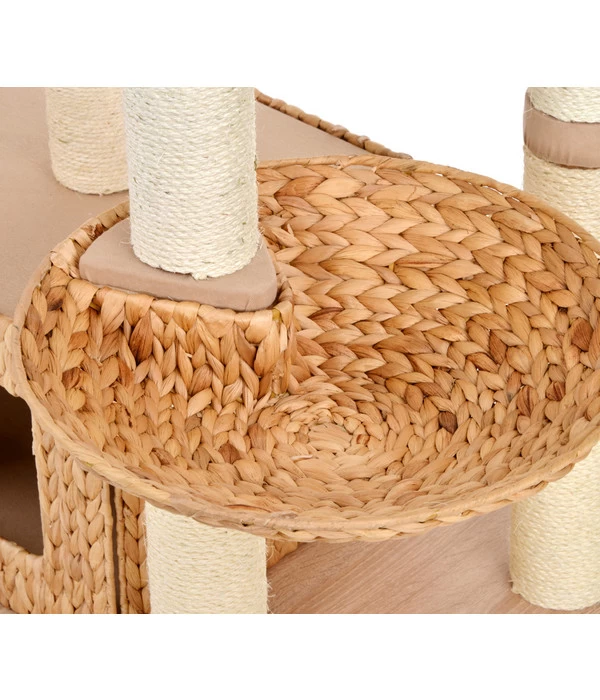 Der Kratzbaum ist außerdem aus stabilem Massivholz gefertigt. Der Fuß und die mittlere Plattform bestehen ebenfalls aus Holz, während die Höhle, Liegeflächen und die Liegemulde aus dem Naturmaterial Wasserhyazinthe geflochten sind. Ihre Katze wird Sie für das gute Gefühl auf diesen unterschiedlichen Materialien lieben!