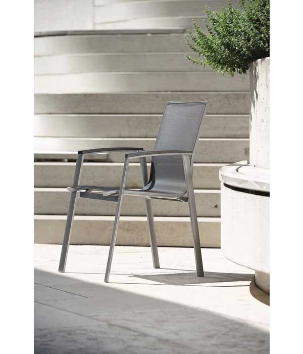 Gartensessel müssen viel aushalten. Wenn sie Tag für Tag draußen auf der Terrasse oder dem Balkon stehen, brennt mal die heiße Sonne auf sie nieder, mal stehen sie buchstäblich im Regen. Und in der schlechten Jahreszeit müssen sie auch noch Schnee und knackigen Frost aushalten. Aber dank moderner Funktionsmaterialien ist das für Gartenmöbel wie den Stern Stapelsessel New Top nicht mehr der Rede wert. Deshalb konnte sich der Designer auch voll auf die Optik des Gartensessels konzentrieren, die ihm, wie wir finden, perfekt gelungen ist. Zu dem zeitgemäß schlichten Gestell in der Trendfarbe Graphit kombinierte er ein silberfarbenes Outdoor-Gewebe – ein Mix, mit dem der Gartensessel Ihrem Outdoor-Bereich eine Atmosphäre nobler Eleganz verleihen wird. Genießen Sie bald mit Ihrer Familie und guten Freunden viele entspannte Stunden in dem Stern Stapelsessel New Top!