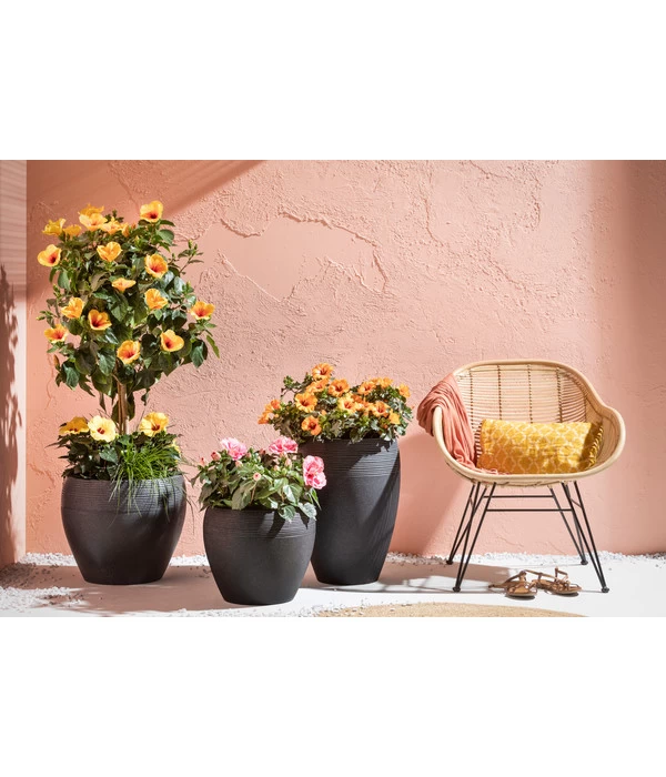 Klassisches Terrakotta, praktischer Kunststoff, moderne Stein- oder Beton-Optik – mit einem Kübel Ihrer Wahl können Sie die dekorative Ausstrahlung Ihrer Hibiskus-Pflanze noch unterstützen. Achten Sie dabei auf eine ausreichende Topfgröße, als alte Gärtnerregel gilt: Topfumfang und Kronengröße sollten etwa gleich groß sein. Außerdem sollte der Topf einen Wasserabfluss am Boden und eine Drainageschicht haben, denn wie andere Kübel-Pflanzen mag auch der Hibiskus keine Staunässe.